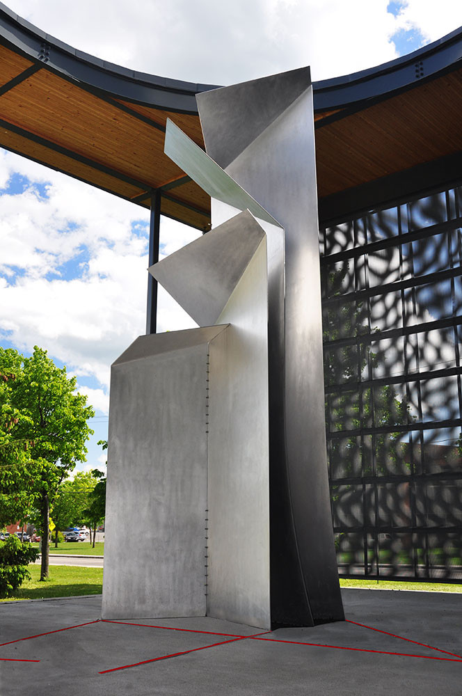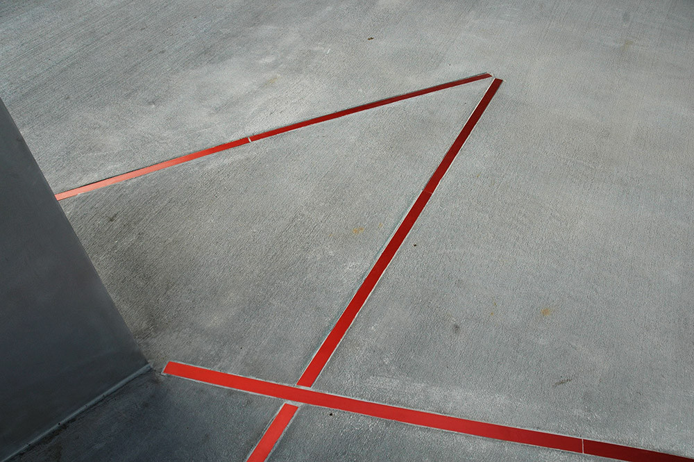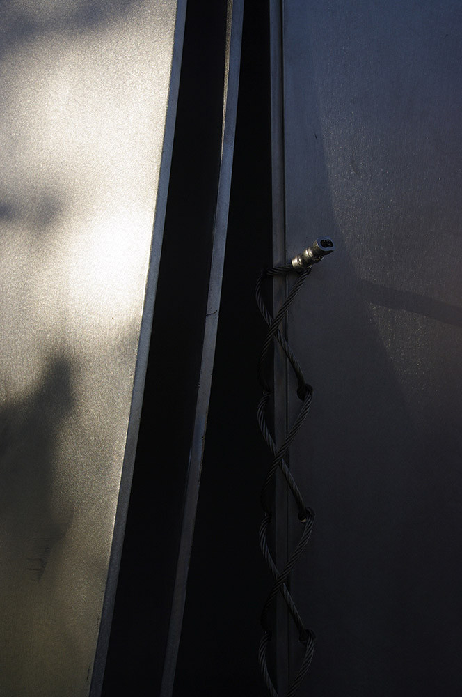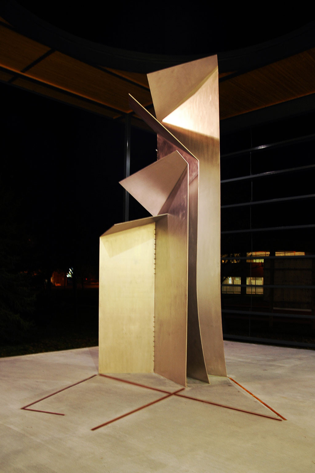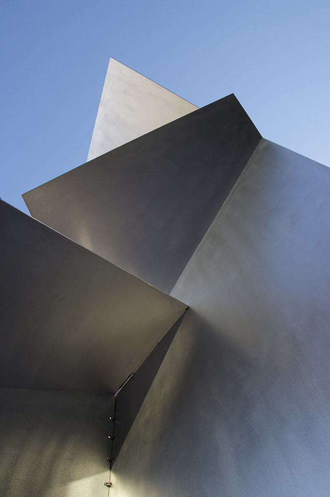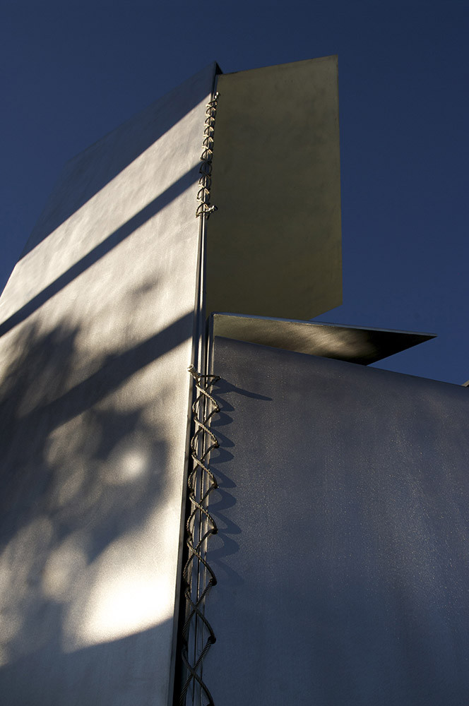 Quelques formes simples se déploient sous l’ouverture. Cette découpe du toit recadre constamment l’image du ciel, l’image du temps. Singulier en architecture, ce cercle anime un espace intime. La sculpture s’y déploie comme un livre tressé. En cherchant la lumière, elle dévoile ses ombres et ses histoires. Les coins sont repliés comme si la page était importante à conserver. Au sol, les lignes colorées rappellent l’idée du pliage, du plan ou de l’ombre projetée du sud-est.