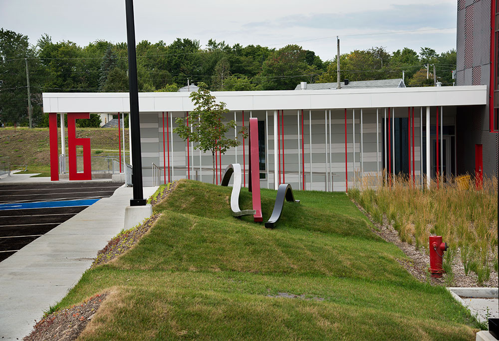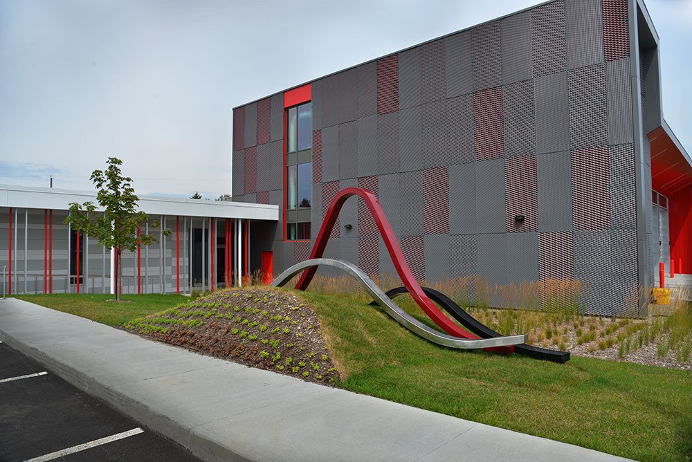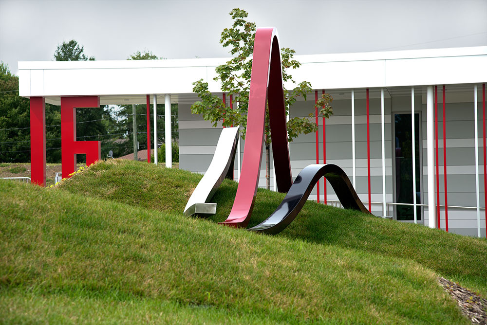 Trois ondes déphasées s’articulent l’une par rapport à l’autre et tentent de s’aligner sur un terrain en pente dont le dénivelé est accentué par des ondulations. À ce déséquilibre répondent les notions de mouvement et d’adaptation en situations inattendues et changeantes.