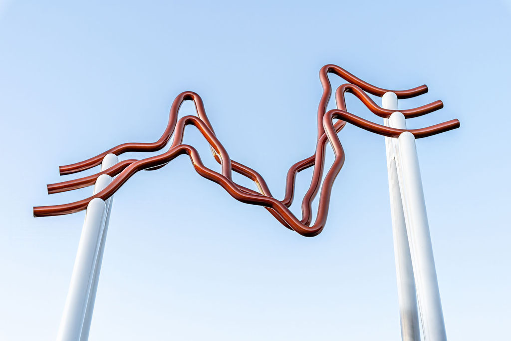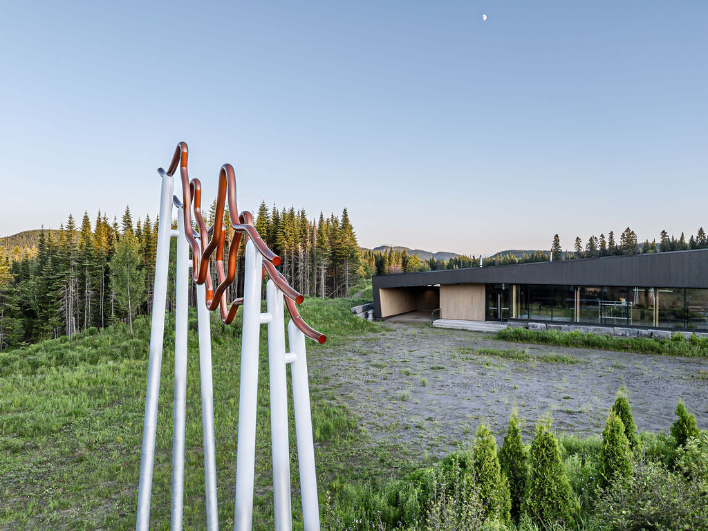 L’œuvre exprime la majestuosité des Laurentides dont les reliefs géologiques ont été sculptés par le passage des glaciers, au fil de milliers d’années. Les formes de dénivelés ou de courbes topographiques déposées au sommet de fins piliers verticaux invitent à entrer dans le paysage. L’œuvre symbolise le sensible va-et-vient entre les échelles macroscopique et microscopique ressenti par les visiteurs. Autant de perspectives historiques, sensorielles, psychiques possibles pour aborder ce riche et vaste paysage boréal.